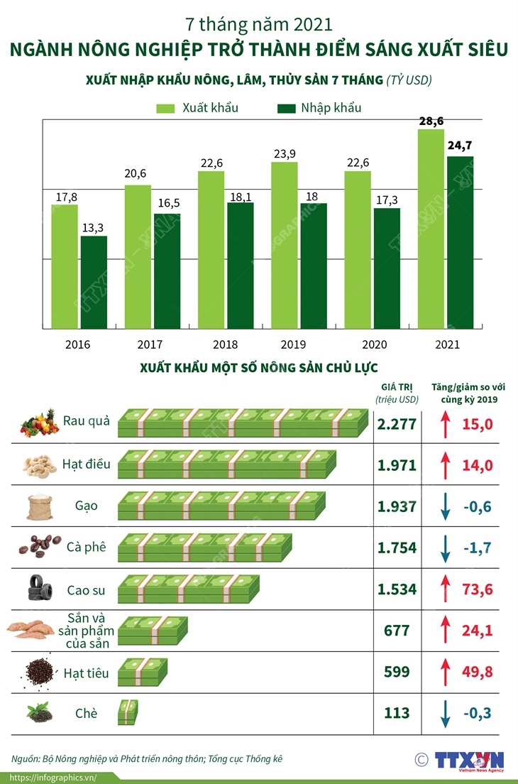 7 tháng đầu năm 2021, trong khi cán cân thương mại của cả nước nghiêng về nhập siêu thì ngành nông nghiệp trở thành điểm sáng với các mặt hàng nông, lâm, thủy sản xuất siêu ấn tượng 3,9 tỷ USD.