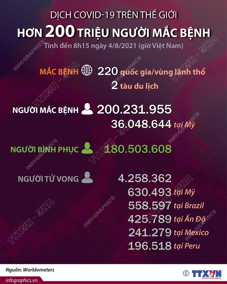 Tính đến 4/8/2021, số ca mắc COVID-19 trên thế giới đã vượt mốc 200 triệu ca, trong đó gần 4,3 triệu người chết và hơn 180,5 triệu người đã bình phục, trong bối cảnh nhiều khu vực đang vật lộn với biến chủng Delta.