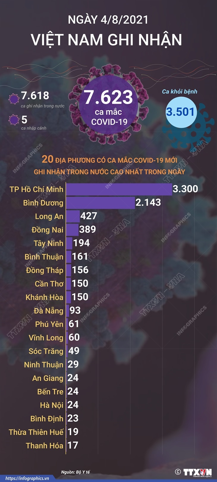 Trong ngày 4/8/2021, Việt Nam ghi nhận 7.623 ca mắc COVID19 mới, trong đó 5 ca nhập cảnh và 7.618 ca ghi nhận trong nước.