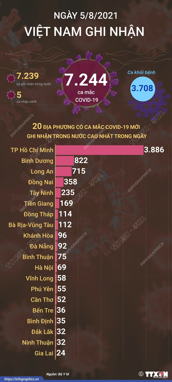 Trong ngày 5/8/2021, Việt Nam ghi nhận 7.244 ca mắc COVID-19 mới, trong đó 5 ca nhập cảnh và 7.239 ca ghi nhận trong nước.