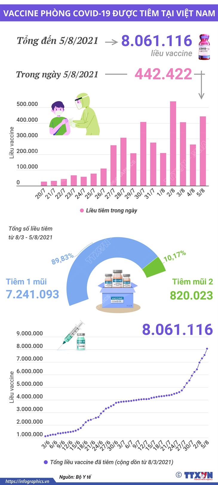 Trong ngày 5/8/2021 có 442.422 liều vaccine phòng COVID-19 được tiêm. Đến nay, tổng số liều vaccine đã được tiêm tại Việt Nam là 8.061.116 liều, trong đó tiêm 1 mũi là 7.241.093 liều, tiêm mũi 2 là 820.023 liều chiếm hơn 10% trên tổng số liều vaccine đã tiêm.
