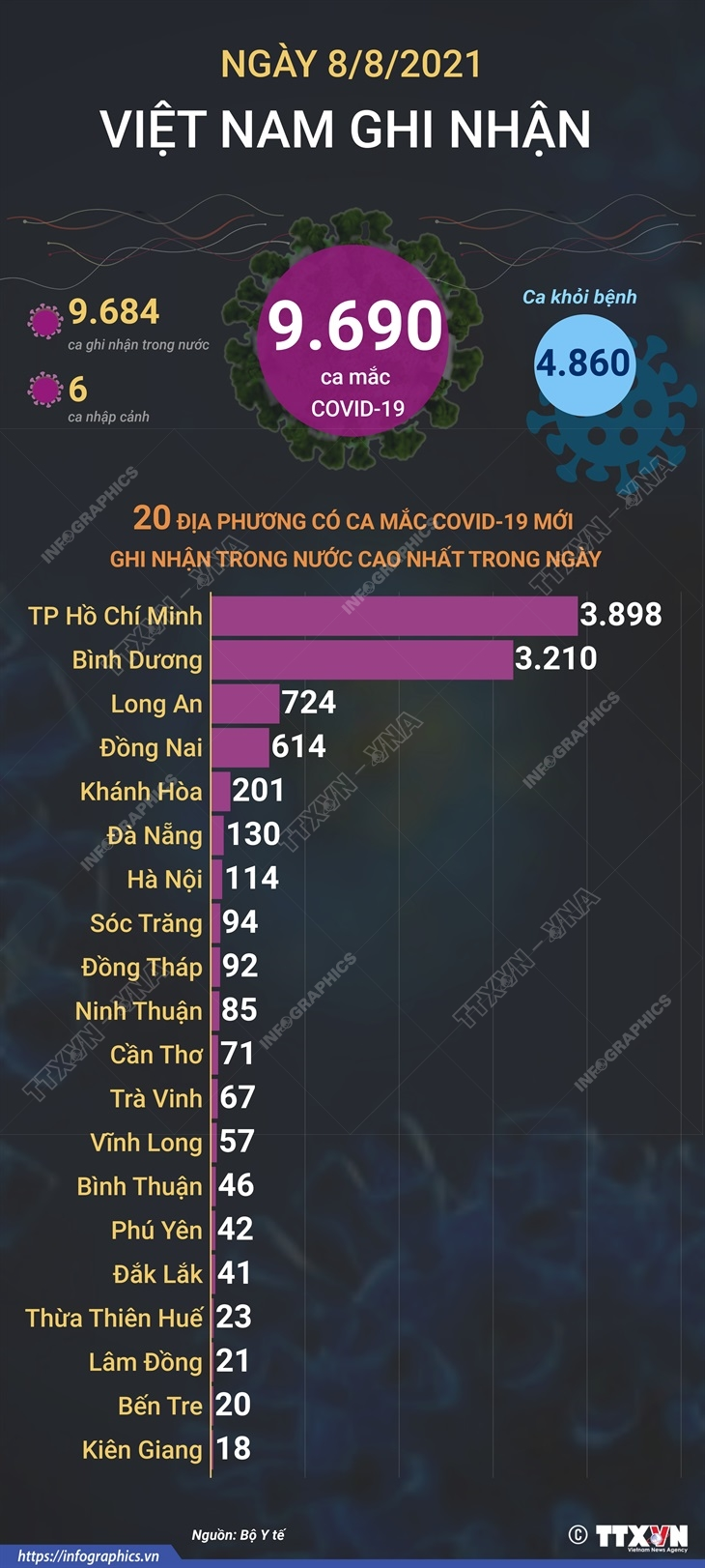 Trong ngày 8/8/2021, Việt Nam ghi nhận 9.690 ca mắc mới COVID-19, trong đó 6 ca nhập cảnh và 9.684 ca ghi nhận trong nước.
