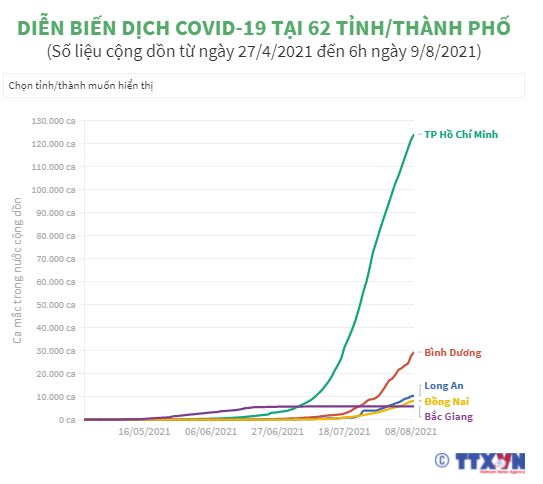 Tính đến 6h ngày 9/8/2021, cả nước ghi nhận thêm 5.155 ca mắc mới, nâng tổng số ca mắc COVID-19 trong nước lên 211.630 ca tại 62 tỉnh, thành phố. Trong đó, TP Hồ Chí Minh đã vượt 124.000 ca, liên tiếp ghi nhận nhiều ca mắc mới liên quan đến nhiều ổ dịch.