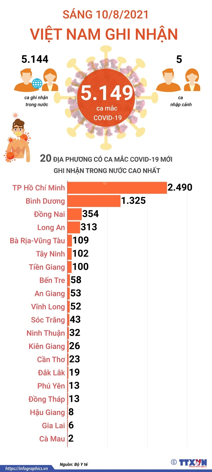 Tính từ 18h30 ngày 9/8 đến 6h ngày 10/8/2021, Việt Nam ghi nhận 5.149 ca mắc COVID-19 mới, trong đó 5 ca nhập cảnh và 5.144 ca ghi nhận trong nước.