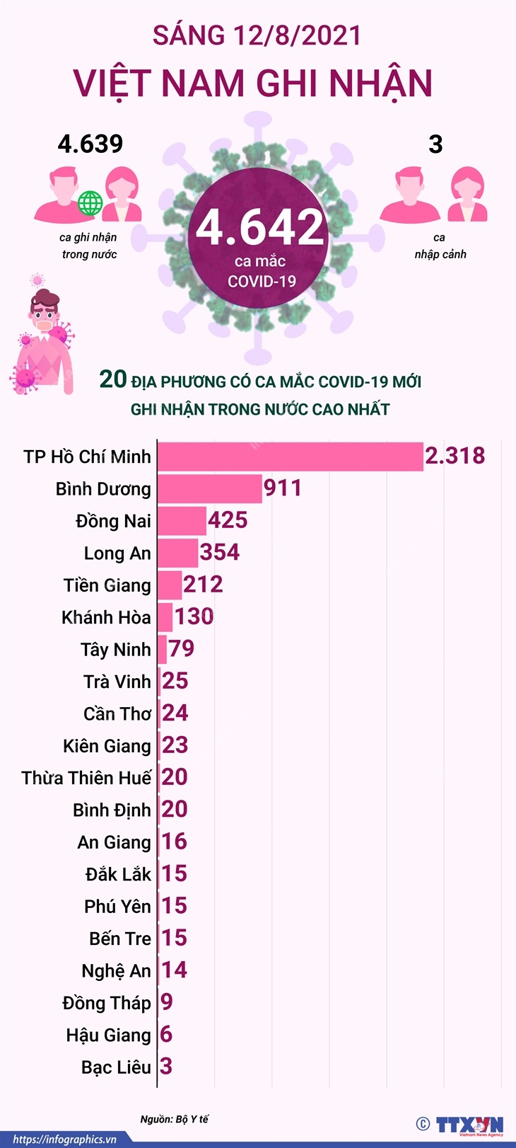Tính từ 18h30 ngày 11/8 đến 6h ngày 12/8/2021, Việt Nam ghi nhận 4.642 ca mắc COVID-19 mới, trong đó 3 ca nhập cảnh và 4.639 ca ghi nhận trong nước.