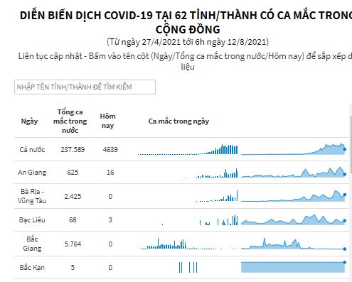 Số ca mắc mới COVID-19 tính từ ngày 27/4 đến 6h ngày 12/8/2021 tại Việt Nam là 237.589 ca. Trong đó có 2/62 tỉnh, thành phố đã qua 14 ngày không ghi nhận trường hợp nhiễm mới trong nước là: Quảng Ninh, Bắc Kạn.