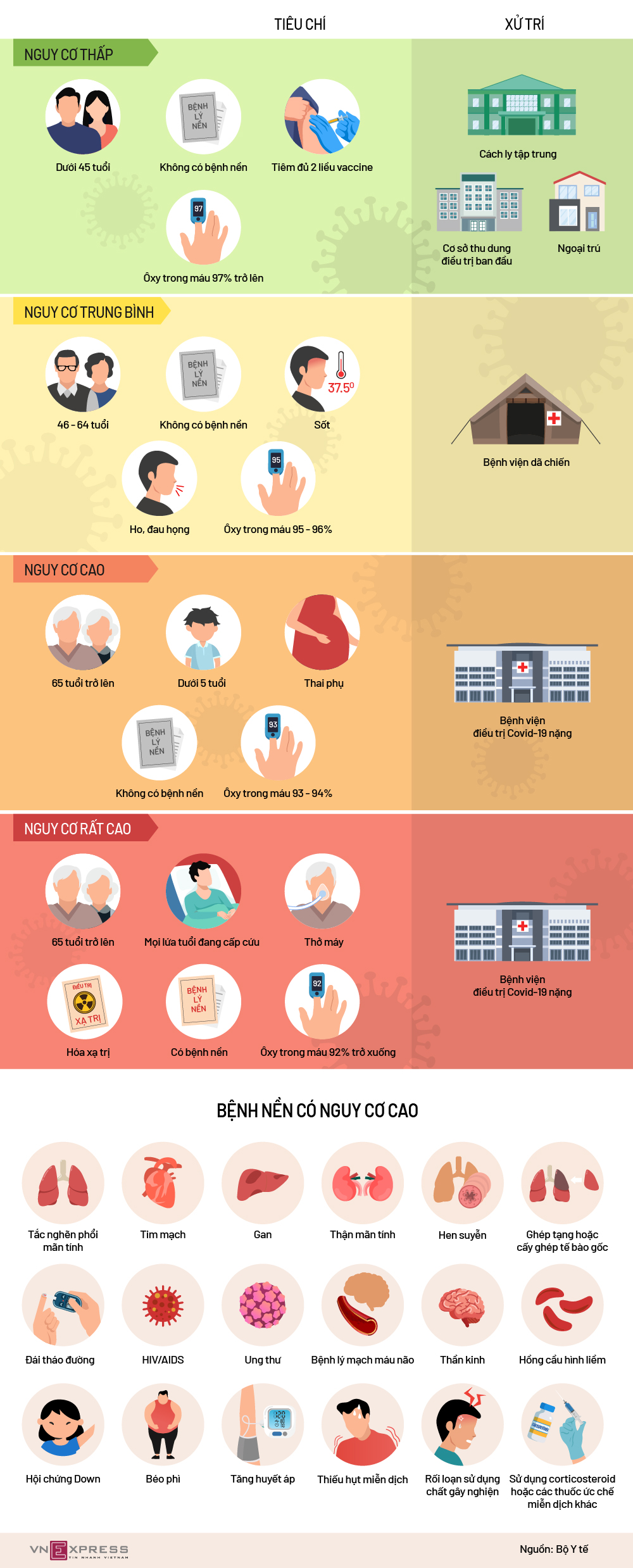 Bộ Y tế phân loại người nhiễm nCoV theo 4 nhóm nguy cơ, trong đó người từ 65 tuổi trở lên mắc bệnh lý nền; người đang tình trạng cấp cứu; người có SpO2 dưới 92% thuộc nhóm nguy cơ cao trở nặng hoặc nguy kịch.