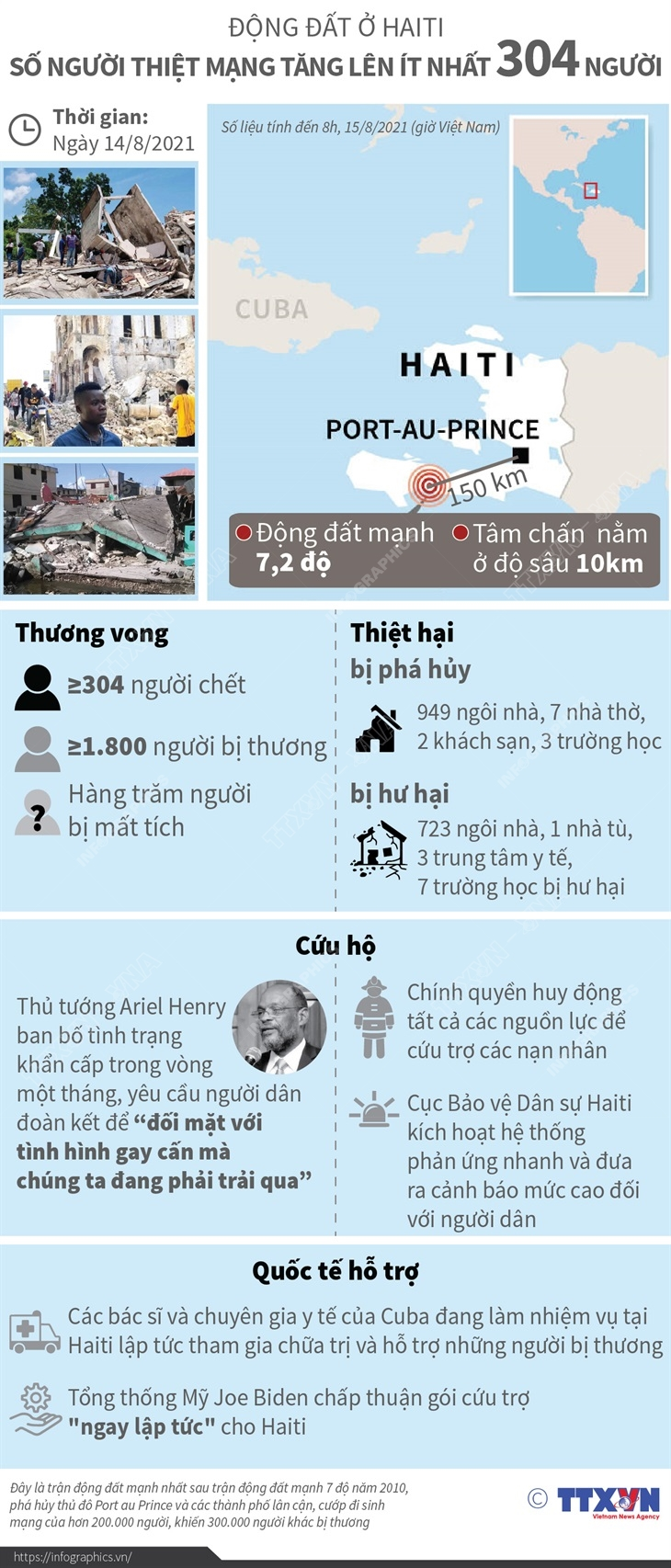 Thủ tướng Haiti Ariel Henry ngày 14/8/2021 đã ban bố tình trạng khẩn cấp trong vòng một tháng tại nước này sau khi xảy ra vụ động đất mạnh 7,2 độ làm ít nhất 304 người thiệt mạng.