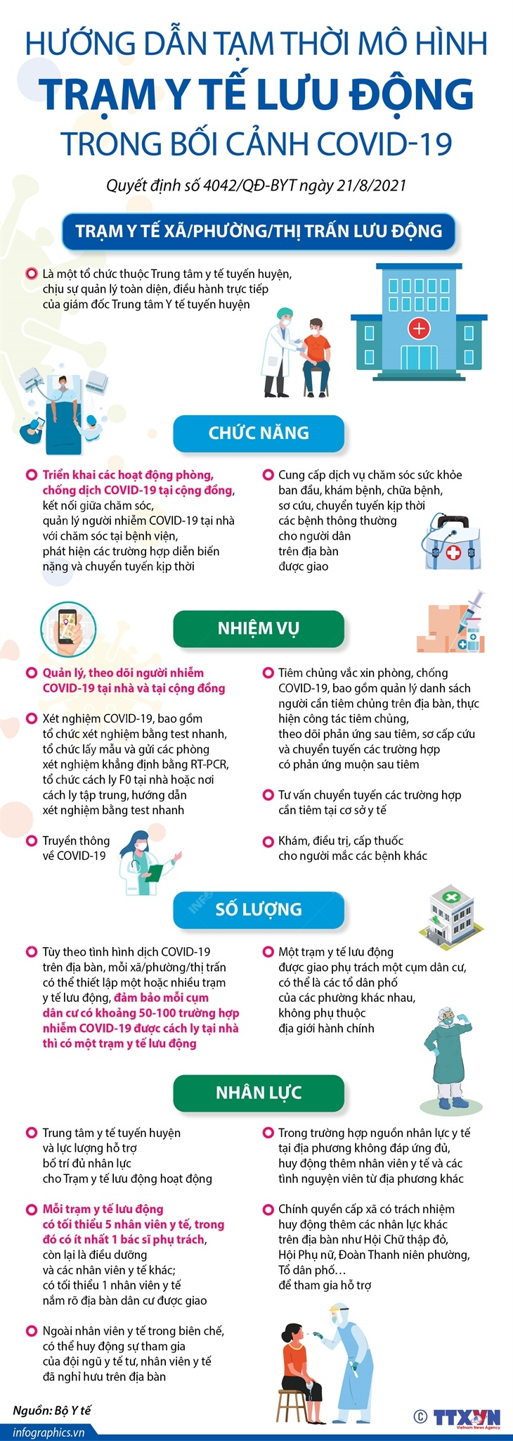 Ngày 21/8/2021, Thứ trưởng Bộ Y tế Nguyễn Trường Sơn đã ký Quyết định 4042/QĐ BYT ban hành Hướng dẫn tạm thời mô hình trạm y tế lưu động trong bối cảnh dịch COVID-19.