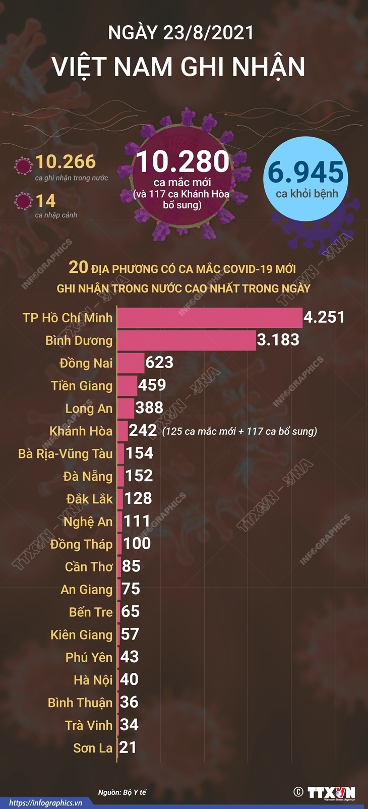 10.280 ca mắc Covid-19 trong ngày 23/8/2021, 6.945 ca khỏi bệnh