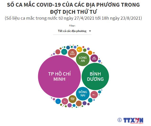 Trong đợt dịch thứ tư, từ 27/4/2021 đến 18h30 ngày 23/8/2021, cả nước ghi nhận tổng cộng 354.355 ca mắc COVID-19 trong nước tại 62 tỉnh, thành phố. TP Hồ Chí Minh, Bình Dương, Đồng Nai, Long An, Tiền Giang là những địa phương có nhiều ca mắc COVID-19 nhất.