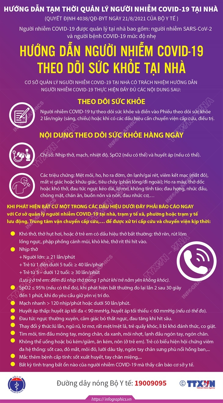 Theo Quyết định 4038/QĐ-BYT ngày 21/8/2021 của Bộ Y tế, cơ sở quản lý người nhiễm COVID-19 tại nhà có trách nhiệm hướng dẫn người nhiễm COVID-19 thực hiện đầy đủ các nội dung theo dõi sức khỏe. Người nhiễm COVID-19 tự theo dõi sức khỏe và điền vào Phiếu theo dõi sức khỏe 2 lần/ngày (sáng, chiều) hoặc khi có các dấu hiệu cần chuyển viện cấp cứu, điều trị.