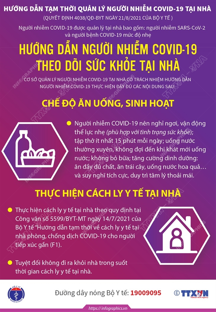 Theo Quyết định 4038/QĐ-BYT ngày 21/8/2021 của Bộ Y tế, người nhiễm COVID-19 nên nghỉ ngơi, vận động thể lực nhẹ tập thở ít nhất 15 phút mỗi ngày uống nước thường xuyên không bỏ bữa... phải thực hiện cách ly y tế tại nhà theo quy định và tuyệt đối không đi ra khỏi nhà trong suốt thời gian cách ly y tế tại nhà.