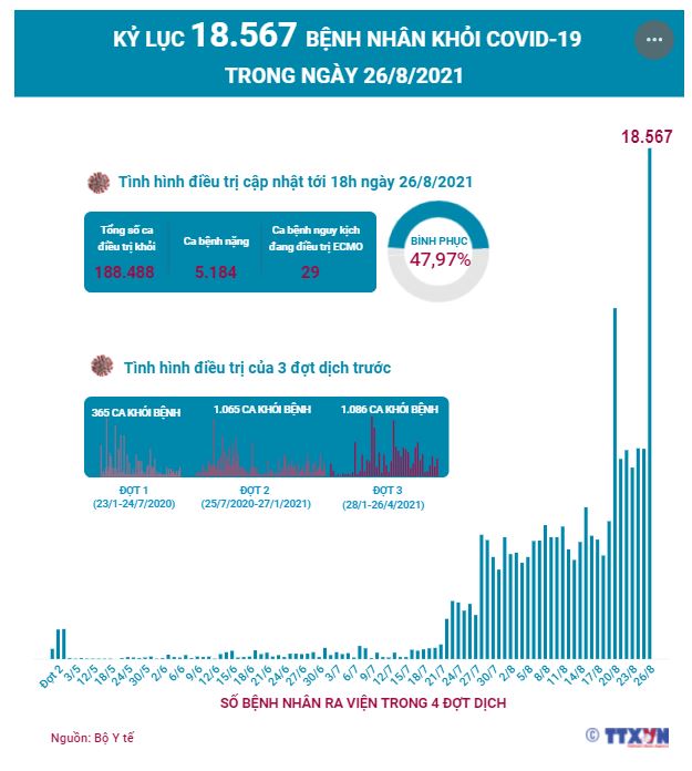 Số bệnh nhân COVID-19 khỏi bệnh trong ngày 26/8/2021 đạt con số cao kỷ lục 18.567 người, nâng tổng số bệnh nhân khỏi bệnh lên 18.488 người và tỷ lệ bình phục đạt 47,97%.
