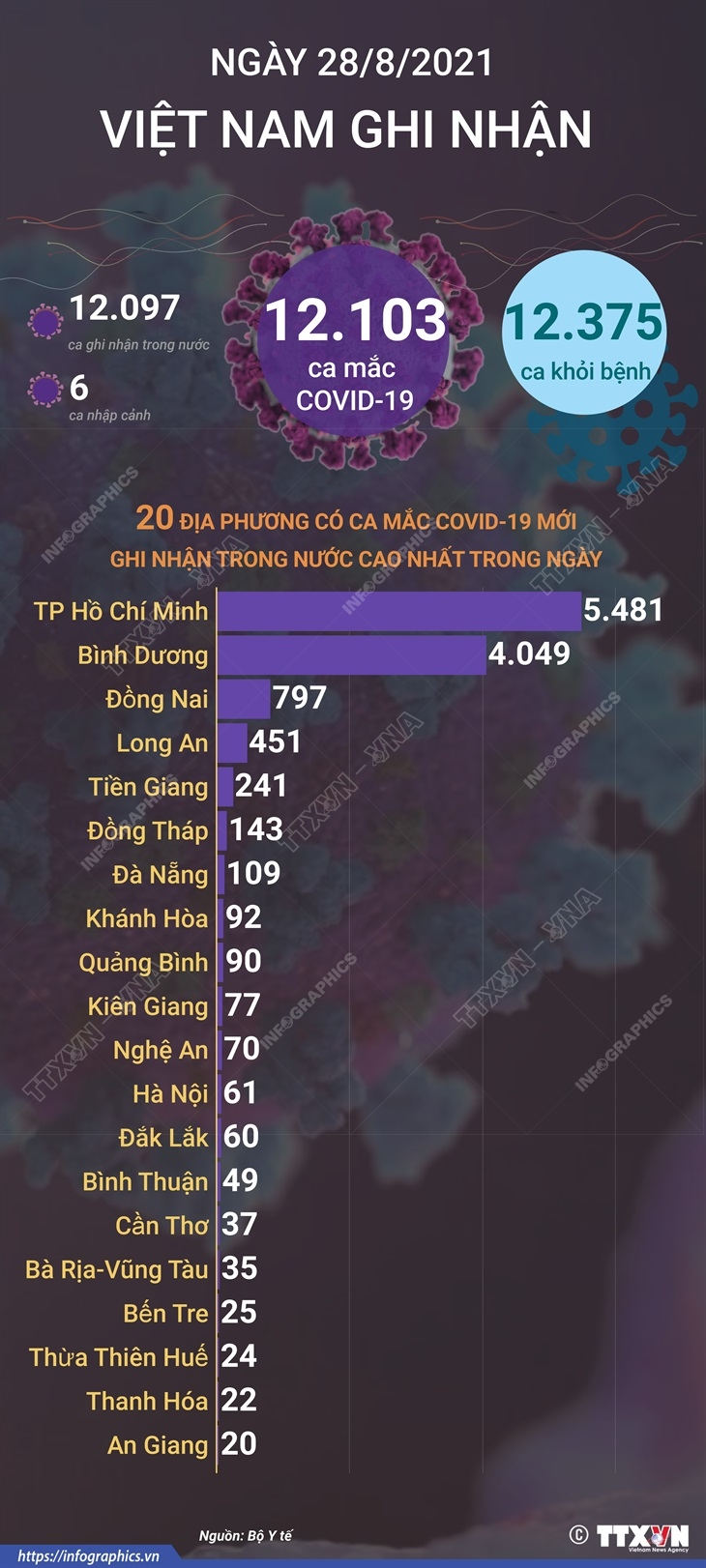 Tính từ 18h ngày 27/8 đến 18h ngày 28/8/2021, Việt Nam ghi nhận 12.103 ca mắc COVID-19 mới, trong đó 6 ca nhập cảnh và 12.097 ca trong nước.