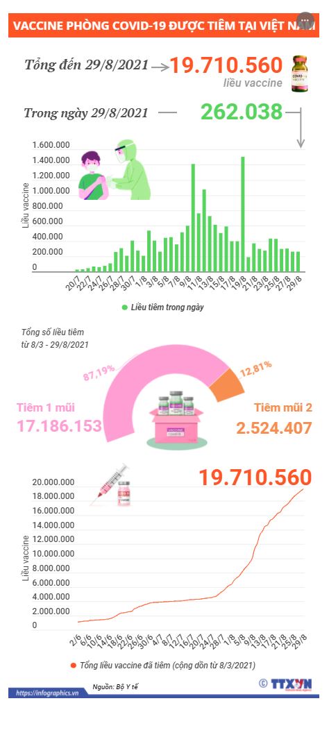 Trong ngày 29/8/2021 có 262.038 liều vaccine phòng COVID-19 được tiêm. Như vậy, tổng số liều vaccine đã được tiêm tại Việt Nam là 19.710.560 liều, trong đó tiêm 1 mũi là 17.186.153 liều, tiêm mũi 2 là 2.524.407 liều.