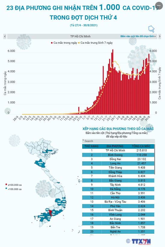 23 địa phương trên cả nước đã ghi nhận hơn 1.000 ca mắc COVID-19 trong đợt dịch thứ 4, trong đó có 2 địa phương vượt 100.000 ca là Thành phố Hồ Chí Minh và Bình Dương.