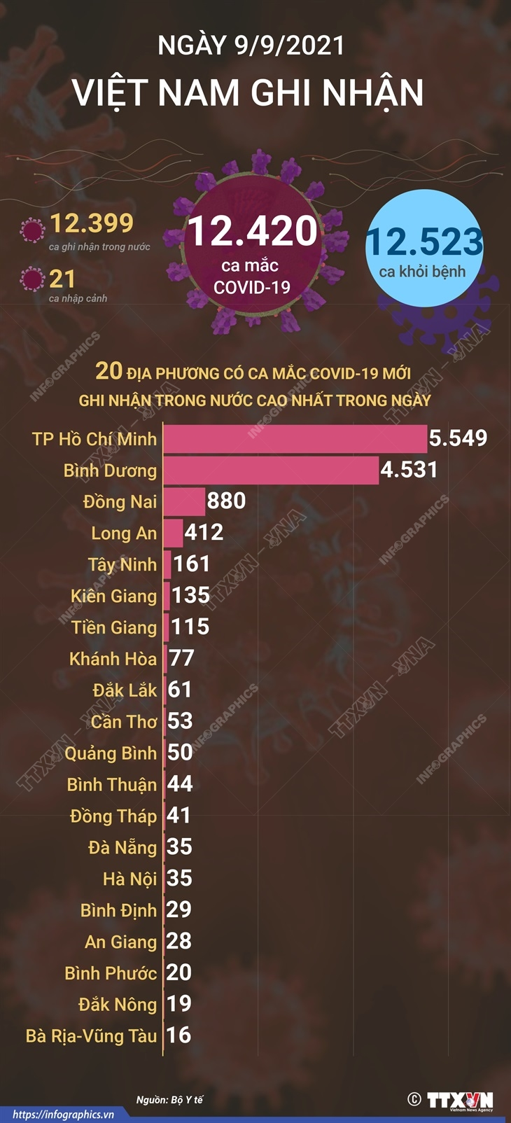 Tính từ 17h ngày 8/9 đến 17h ngày 9/9/2021, Việt Nam ghi nhận 12.420 ca mắc mới COVID-19, trong đó 21 ca nhập cảnh và 12.399 ca trong nước.
