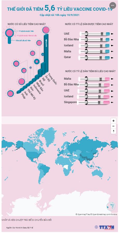 Hiện đã có 5,6 tỷ liều vaccine COIVD-19 được tiêm trên toàn thế giới, trong đó Trung Quốc là nước có số liều tiêm cao nhất với 2,12 tỷ liều. Malta, Bồ Đào Nha, Các Tiểu vương quốc Arab Thống nhất (UAE), Iceland và Singapore là 5 nước có tỷ lệ dân tiêm đủ liều cao nhất - trên 76%.