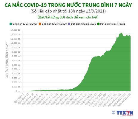 Việt Nam đã có 4 đợt dịch COVID-19. Đợt dịch thứ 4 (từ 27/4/2021 đến 18h ngày 13/9/2021) có ca mắc trong nước nhiều nhất, với 620.165 ca tại 62 tỉnh, thành phố. Dưới đây là biểu đồ ca mắc COVID-19 mới trong nước trung bình 7 ngày.