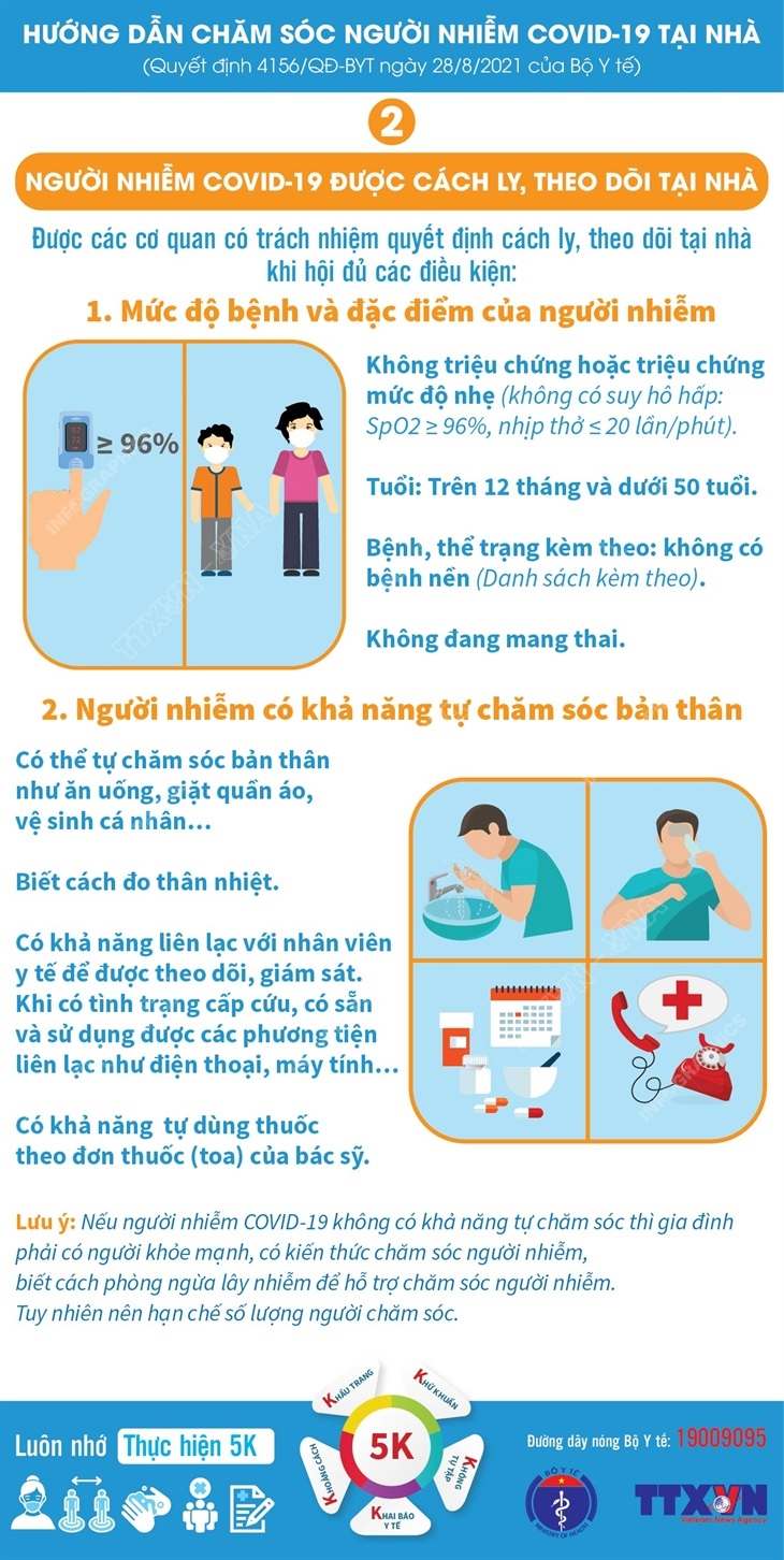 Người nhiễm COVID-19 được các cơ quan có trách nhiệm quyết định cách ly, theo dõi tại nhà khi hội đủ các điều kiện về mức độ bệnh và đặc điểm của người nhiễm, người nhiễm có khả năng tự chăm sóc bản thân.