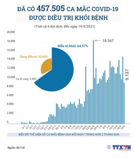 Tính đến hết ngày 19/9/2021, Việt Nam đã điều trị khỏi 457.505 ca COVID-19 trên tổng số 687.063 ca mắc. Như vậy, đến nay đã có gần 65% bệnh nhân được công bố khỏi bệnh.