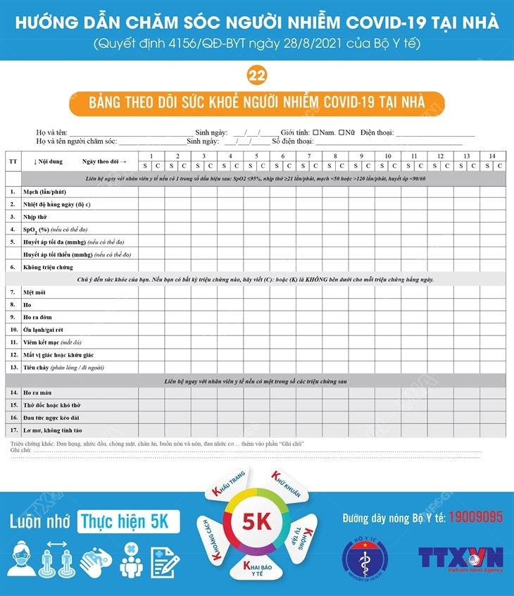 Bảng theo dõi sức khỏe người nhiễm COVID-19 điều trị tại nhà giúp theo dõi sức khỏe hằng ngày của người bệnh để phát hiện những dấu hiệu chuyển nặng và can thiệp điều trị kịp thời.