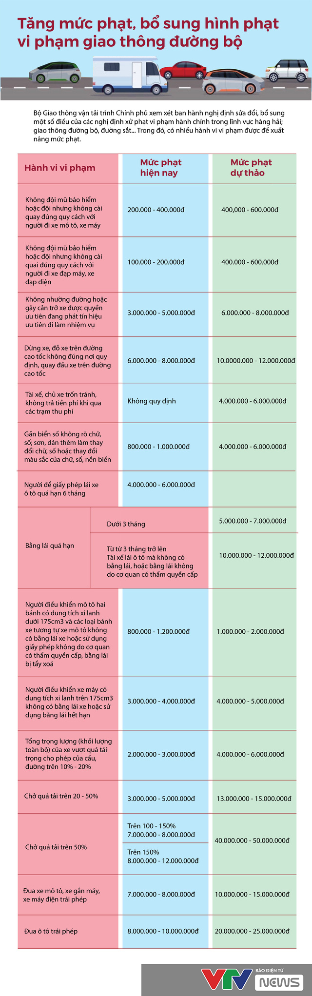 Theo Nghị định sửa đổi, bổ sung được Bộ Giao thông vận tải trình Chính phủ xem xét ban hành, nhiều hành vi vi phạm giao thông được đề xuất tăng mức phạt lên gấp nhiều lần, như lỗi không đội mũ bảo hiểm, không trả phí khi qua trạm thu phí, không nhường đường xe ưu tiên...