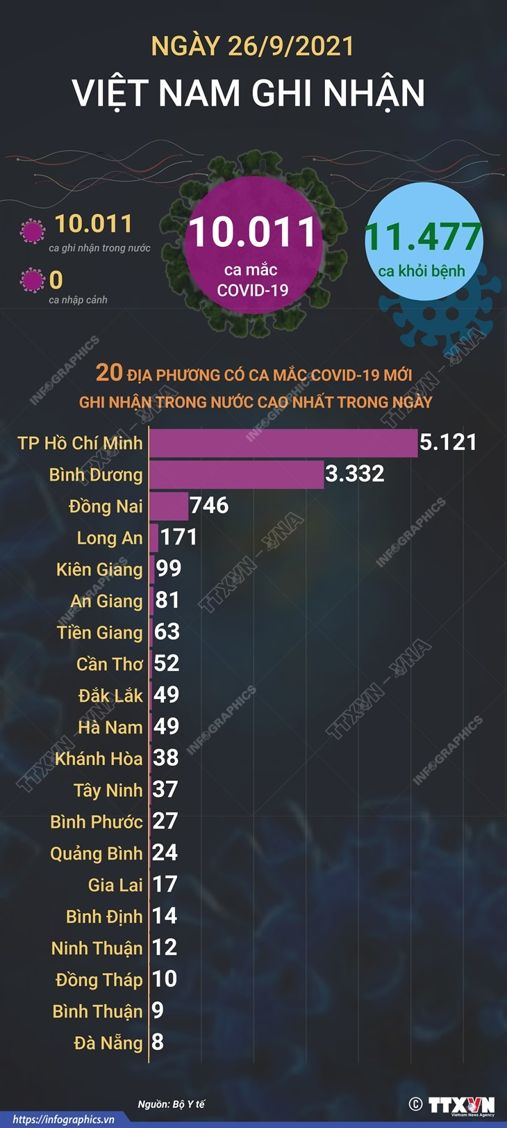 Tính từ 17h ngày 25/9 đến 17h ngày 26/9/2021, Việt Nam ghi nhận 10.011 ca mắc COVID-19 mới.
