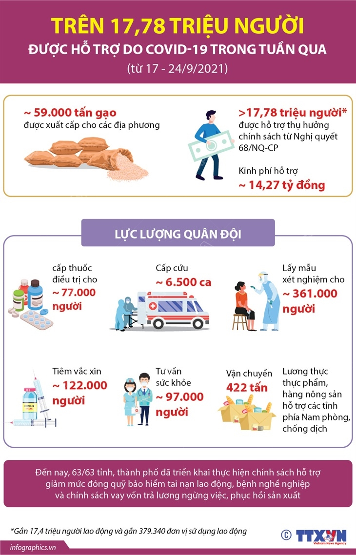 Trên 17,78 triệu người được hỗ trợ do Covid-19 trong tuần qua (từ 17 - 24/9/2021)