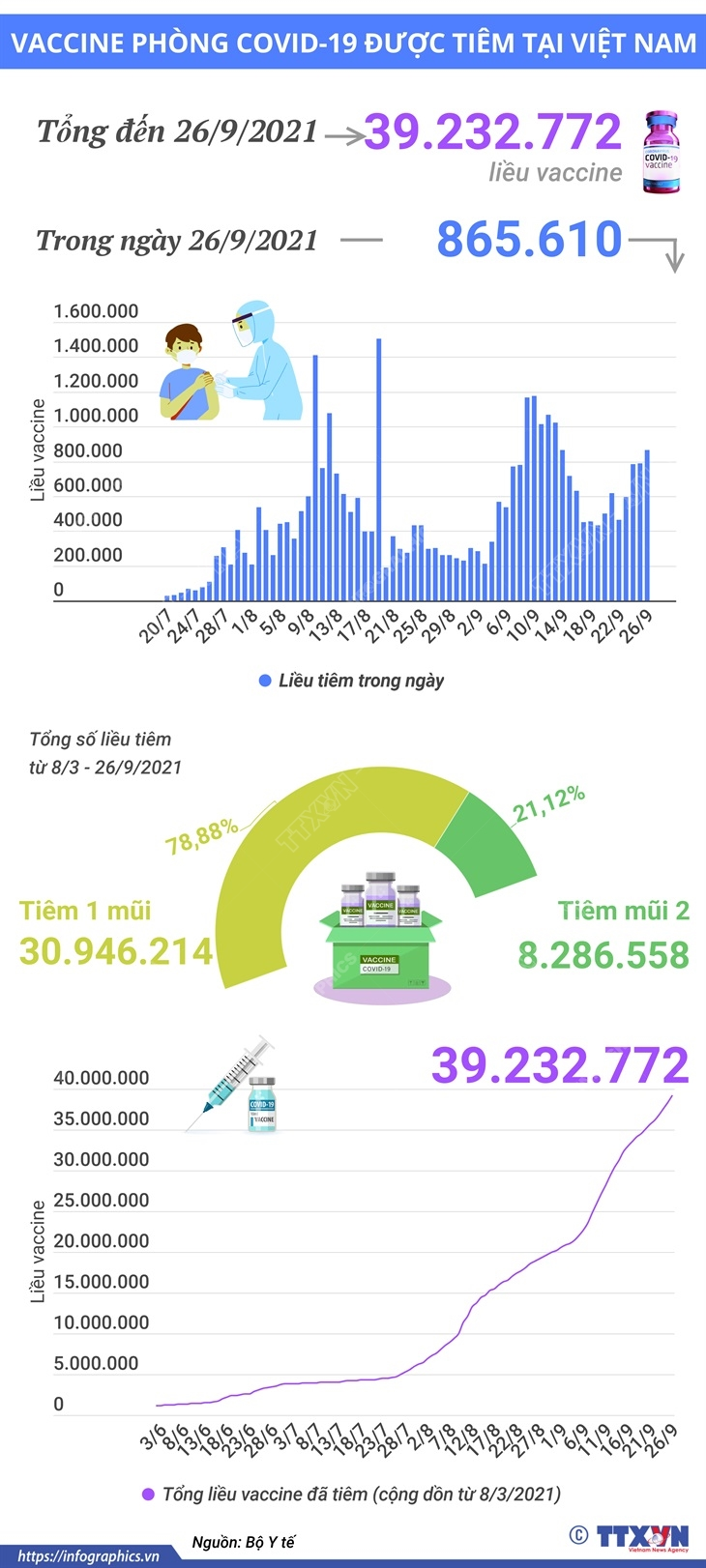 Trong ngày 26/9/2021 có 865.610 liều vaccine phòng COVID-19 được tiêm. Như vậy, tổng số liều vaccine đã được tiêm tại Việt Nam là 39.232.772 liều, trong đó tiêm 1 mũi là 30.946.214 liều, tiêm mũi 2 là 8.286.558