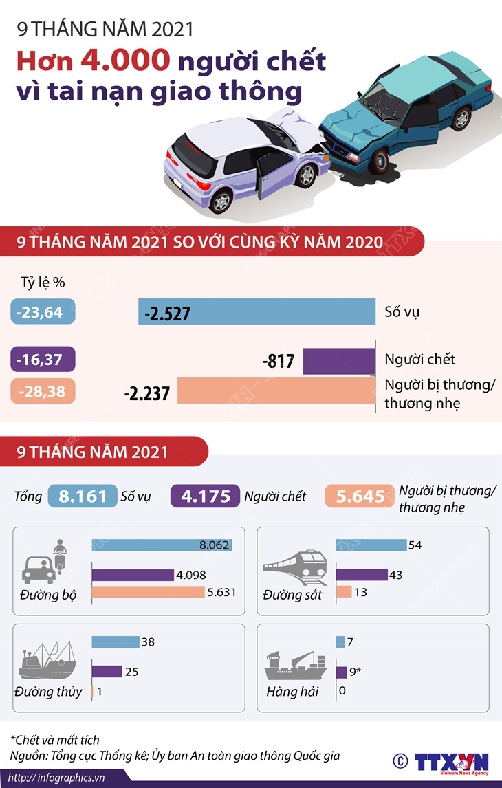 Trong 9 tháng năm 2021, trên toàn quốc xảy ra 8.161 vụ tai nạn giao thông, làm chết 4.175 người, bị thương 5.645 người. So cùng kỳ năm 2020, số vụ tai nạn giao thông giảm 2.527 vụ (23,64%), số người chết giảm 817 người (16,37%), số người bị thương giảm 2.237 người (28,38%).
