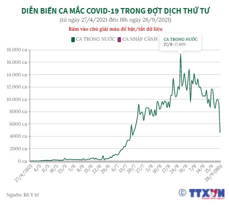 Trong đợt dịch thứ tư, từ ngày 27/4 đến 18h ngày 28/9/2021, Việt Nam ghi nhận 766.110 ca mắc trong nước và 1.678ca nhập cảnh. Biểu đồ dưới đây thể hiện diễn biến ca mắc COVID-19 trong nước qua mỗi ngày.