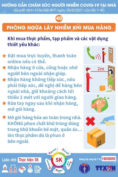 Khi mua thực phẩm, tạp phẩm và các vật dụng thiết yếu khác, gia đình có người nhiễm COVID-19 điều trị tại nhà nên đặt mua trực tuyến, thanh toán online nếu có thể, nhận hàng không tiếp xúc, nếu phải tiếp xúc, đề nghị để hàng bên ngoài nhà, giữ khoảng cách tối thiểu 2 mét với người giao hàng...