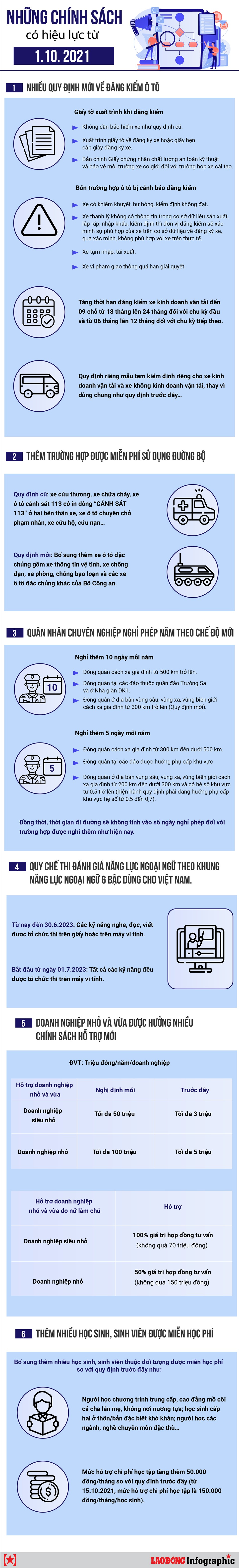 Quy định mới về đăng kiểm ôtô; thêm trường hợp được miễn phí sử dụng đường bộ… là những chính sách mới sẽ có hiệu lực từ tháng 10/2021.
