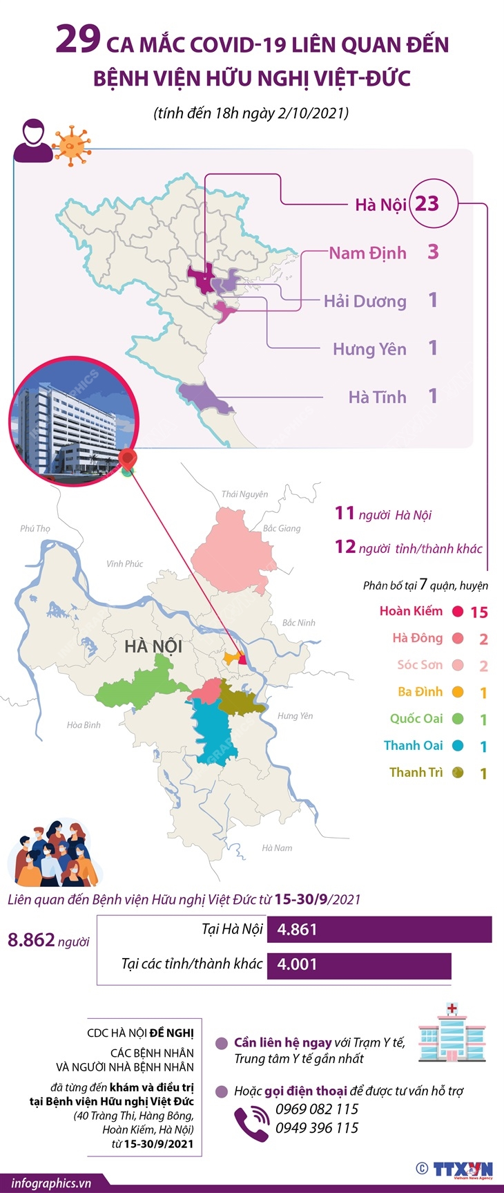 Kể từ ca ghi nhận đầu tiên vào ngày 30/9 đến 18h ngày 2/10/2021, đã có 29 ca mắc COVID-19 liên quan đến Bệnh viện Hữu nghị Việt-Đức, trong đó 23 ca tại Hà Nội, 6 ca còn lại thuộc các tỉnh, thành khác.