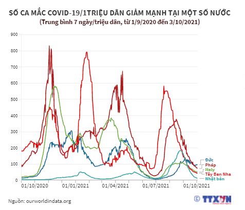 Việc đẩy mạnh tiêm chủng, mở rộng độ bao phủ vaccine COVID-19 đã giúp cho một số nước giảm mạnh tỷ lệ mắc COVID-19, cũng như giảm tỷ lệ tử vong. Biểu đồ dưới đây cho thấy số ca mắc COVID-19 trung bình 7 ngày/1 triệu dân đã giảm mạnh tại Đức, Pháp, Italy, Tây Ban Nha, Nhật Bản trong khoảng thời gian từ tháng 9/2020 đến tháng 10/2021.