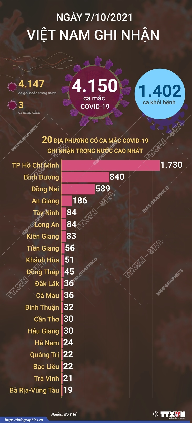 Tính từ 17h ngày 6/10 đến 17h ngày 7/10/2021, Việt Nam ghi nhận 4.150 ca mắc COVID-19 mới, trong đó 3 ca nhập cảnh và 4.147 ca trong nước tại 43 tỉnh, thành phố.