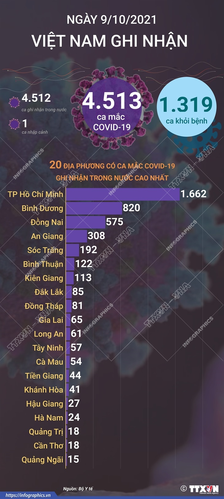 Tính từ 17h ngày 8/10 đến 17h ngày 9/10/2021, Việt Nam ghi nhận 4.513 ca mắc COVID-19 mới, trong đó 1 ca nhập cảnh và 4.512 ca trong nước tại 40 tỉnh, thành phố.