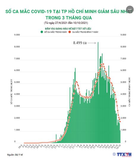 Trong ngày 10/10/2021, TP Hồ Chí Minh ghi nhận 1.067 ca mắc COVID-19. Số ca mắc COVID-19 trên địa bàn tiếp tục đà giảm mạnh, tiến sát tới ngưỡng chỉ còn 3 con số. Biểu đồ dưới đây cho thấy số ca mắc COVID-19 tại TP Hồ Chí Minh giảm sâu nhất trong 3 tháng qua.