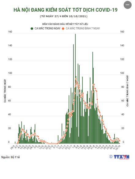 Những ngày gần đây, tình hình dịch bệnh COVID-19 tại Hà Nội đang được kiểm soát tốt. Biểu đồ cho thấy số ca mắc COVID-19 của Hà Nội liên tục đi xuống rất thấp.