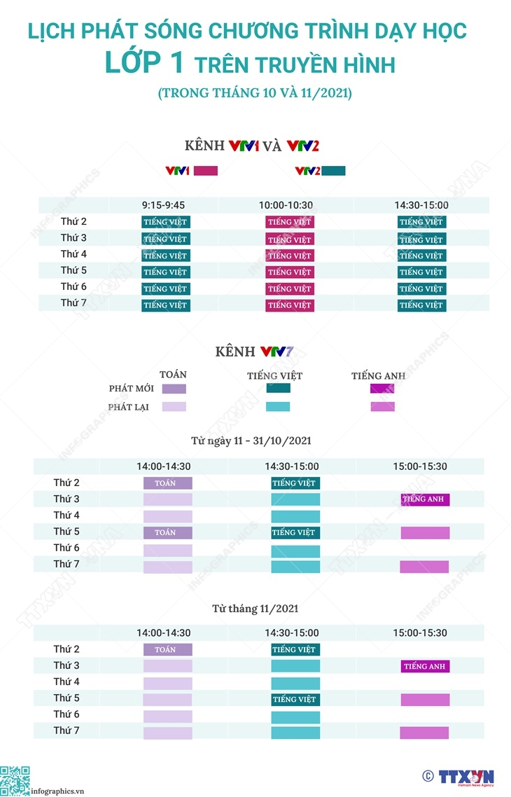 Lịch phát sóng chương trình dạy học lớp 1 trên truyền hình (trong tháng 10 và 11/2021)