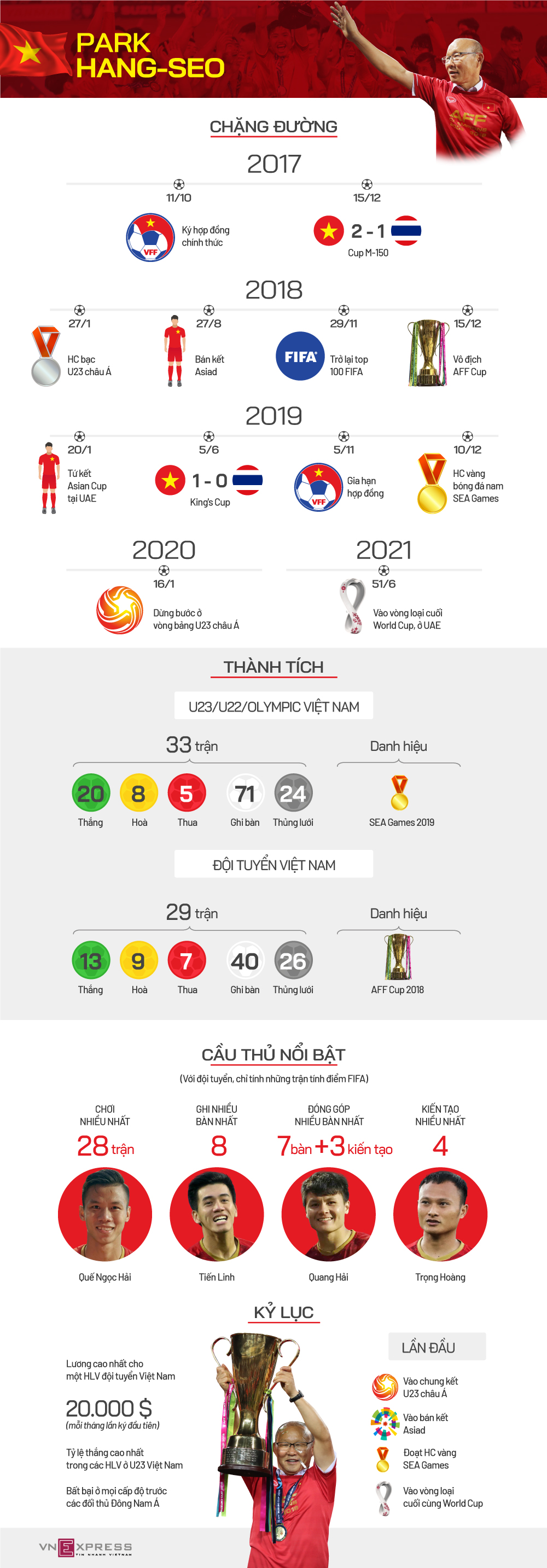 Ngày 11/10/2017, HLV Park Hang-seo chính thức ký hợp đồng với VFF. Và từ đó bóng đá Việt Nam chứng kiến những chiến tích chưa từng có ở U23 châu Á, SEA Games hay vòng loại World Cup.