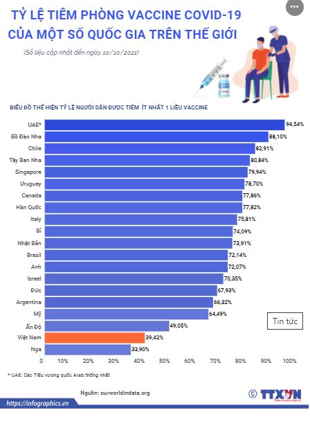 Đã có hơn 6,5 tỷ liều vaccine phòng COVID-19 đã được tiêm cho người dân trên thế giới. Nhiều quốc gia/vùng lãnh thổ đã tiêm ít nhất một liều cho 70-80%, thậm chí vượt 90% dân số. Trong đó, Các Tiểu vương quốc Arab thống nhất (UAE) đạt trên 94,5% Bồ Đào Nha đạt trên 88% Chile gần 83% Tây Ban Nha trên 80% Singapore gần 80%, Israel trên 70,2%, Mỹ gần 64,5%... Việt Nam là nước có tốc độ tiêm chủng nhanh trong một tháng trở lại đây.
