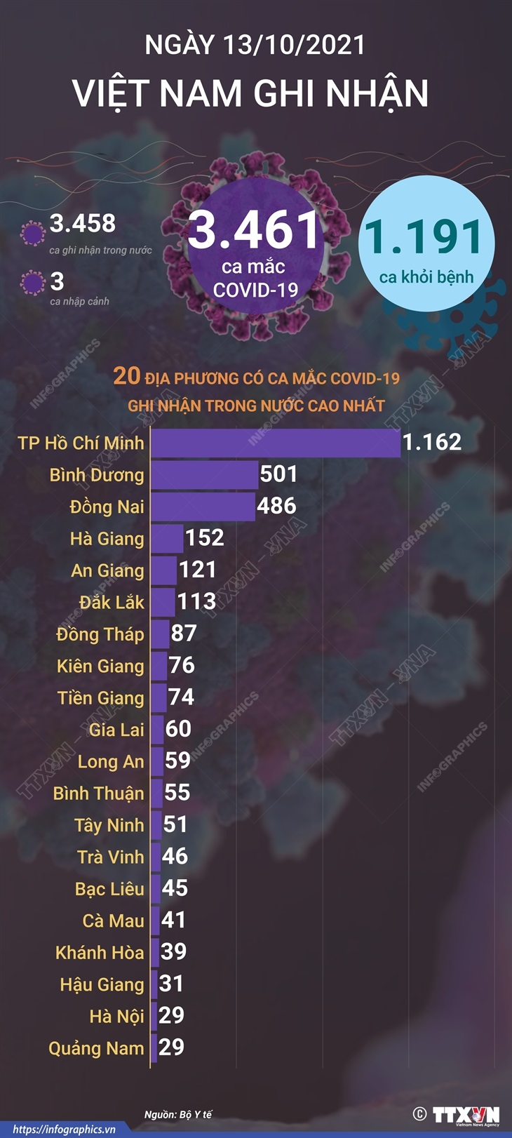 Tính từ 17h ngày 12/10 đến 17h ngày 13/10/2021, Việt Nam ghi nhận 3.461 ca mắc mới COVID-19, trong đó 3 ca nhập cảnh và 3.458 ca trong nước tại 47 tỉnh, thành phố.
