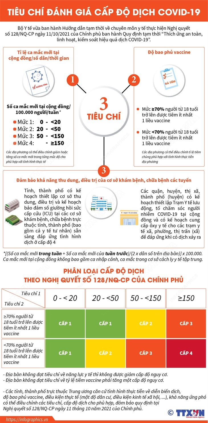 Bộ Y tế vừa ban hành hướng dẫn tạm thời Về chuyên môn y tế thực hiện Nghị quyết số 128/NQ-CP ngày 11/10/2021 của Chính phủ ban hành Quy định tạm thời “Thích ứng an toàn, linh hoạt, kiểm soát hiệu quả dịch COVID-19”. Tiêu chí đánh giá 4 cấp độ thích ứng an toàn COVID-19 dựa trên tỷ lệ F0, độ bao phủ vaccine, khả năng thu dung, điều trị tại cơ sở khám chữa bệnh.
