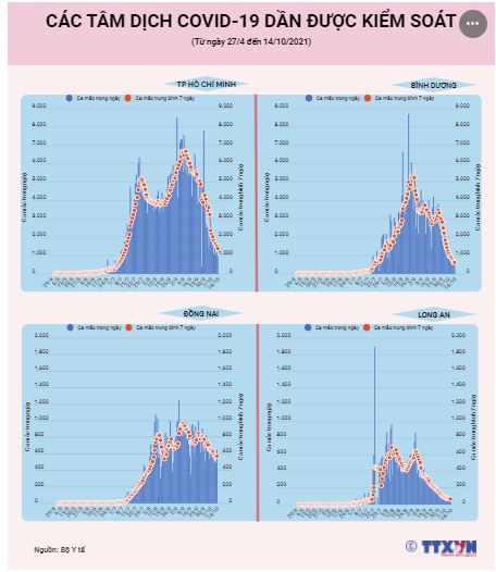 Đến nay, tình hình dịch COVID-19 cơ bản được kiểm soát trên phạm vi toàn quốc. Các tâm dịch như: TP Hồ Chí Minh, Bình Dương, Đồng Nai, Long An… số ca mắc đều giảm dần. Trong ngày 14/10/2021, số ca mắc ở TP Hồ Chí Minh chỉ còn 3 con số. Biểu đồ dưới đây cho thấy số ca mắc COVID-19 tại TP Hồ Chí Minh, Bình Dương, Đồng Nai, Long An đều giảm rõ rệt.