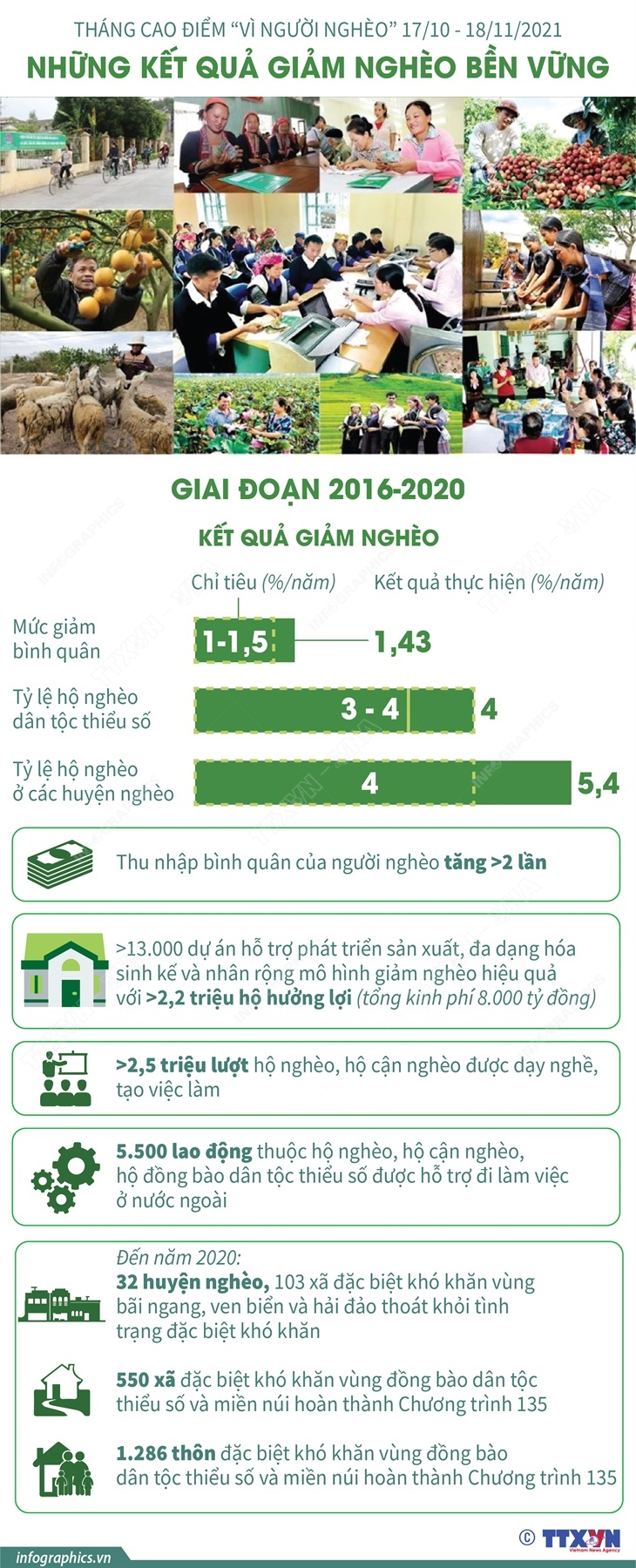Tháng cao điểm “Vì người nghèo” bắt đầu từ 17/10-18/11/2021, nhằm tạo nguồn lực giúp đỡ hộ nghèo, cận nghèo, người có hoàn cảnh đặc biệt khó khăn, người bị thiệt hại do dịch bệnh, thiên tai. Vượt qua nhiều khó khăn, công tác giảm nghèo bền vững ở Việt Nam thời gian qua đã đạt được nhiều kết quả. Hàng loạt chủ trương, chiến lược về xóa đói giảm nghèo được thực hiện đồng bộ để cải thiện đời sống vật chất, tinh thần cho người nghèo; thu hẹp khoảng cách về trình độ phát triển giữa các vùng miền.