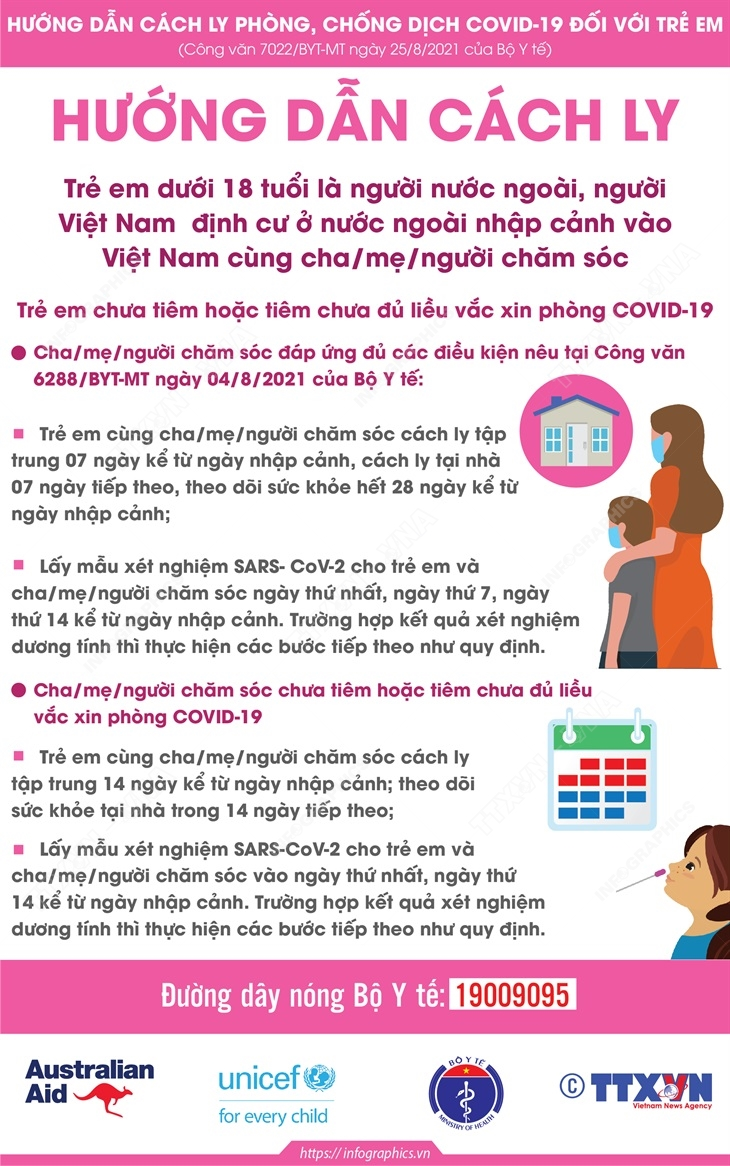 Sau đây là hướng dẫn cách ly đối với trẻ em dưới 18 tuổi là người nước ngoài, người Việt Nam định cư ở nước ngoài nhập cảnh vào Việt Nam cùng cha/mẹ/người chăm sóc. Trẻ em chưa tiêm hoặc tiêm chưa đủ liều vắc xin phòng COVID-19.