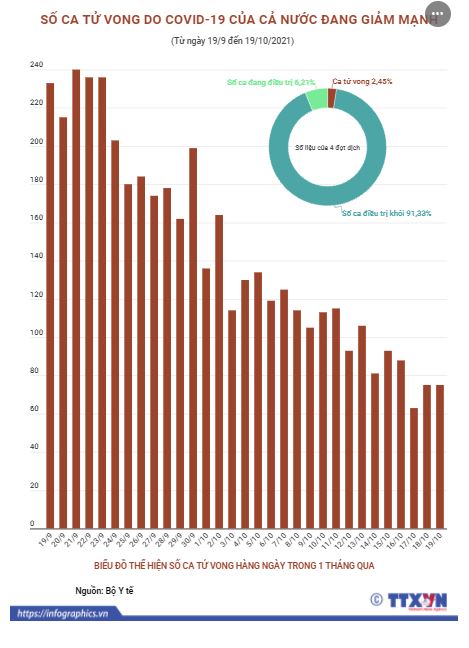 Ngày 19/10/2021, cả nước ghi nhận 75 ca tử vong do COVID-19. Số ca tử vong đang giảm mạnh trong một tháng trở lại đây.